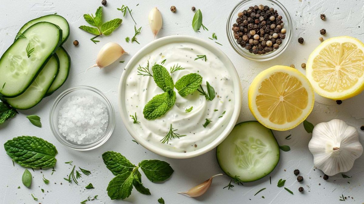 3. Assemblez le tout : Ajoutez l’ail écrasé et le concombre râpé dans le mélange de yaourt et de mayonnaise. Incorporez ensuite les feuilles de menthe, finement hachées.