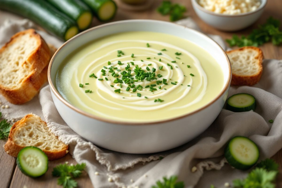 Accompagnez le velouté d'une tartine croustillante à la tapenade, de feta émiettée, ou de noix grillées. Le contraste des textures rendra chaque cuillerée encore plus savoureuse. Plongez dans ce velouté de courgettes au fromage frais pour un dîner chaleureux et plein de joie.