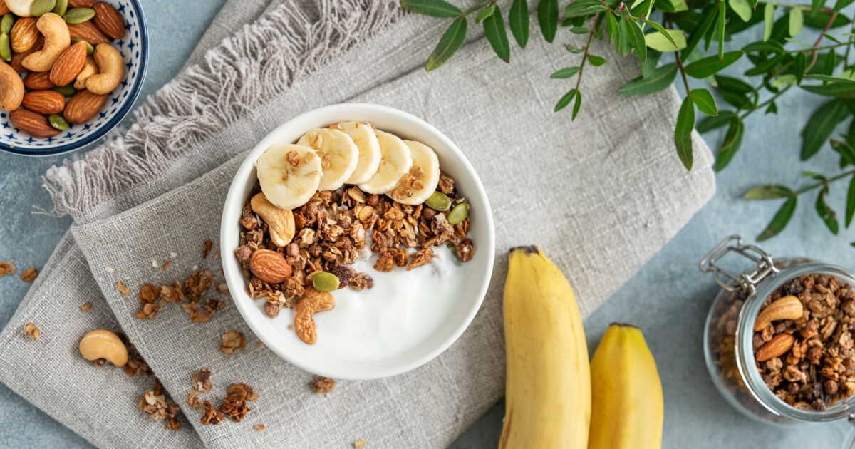 - Dressez une demi-tasse de cottage cheese, une banane découpée et une poignée de granola ou de fruits à coque. Dégustez lentement.