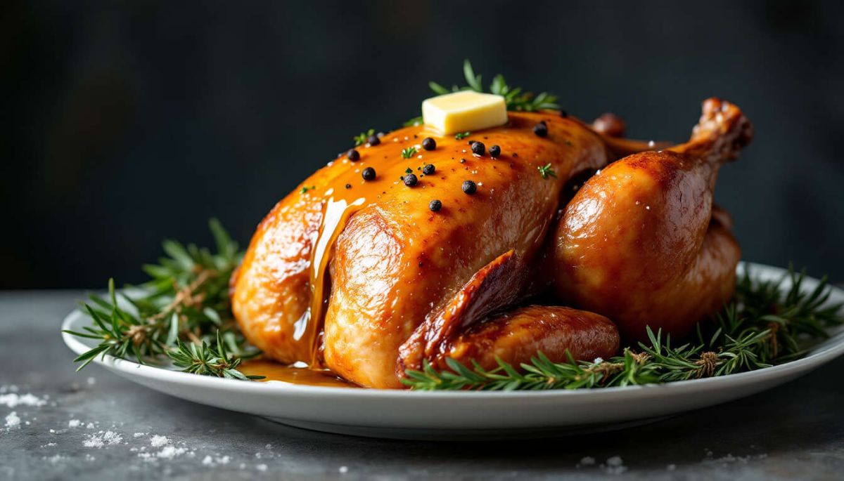 Astuce : Pour présenter votre dinde de manière élégante, déposez-la sur un grand plat entourée de garnitures variées comme des pommes de terre rôties et des légumes. Ajoutez quelques brins de persil ou de thym pour un aspect festif.
