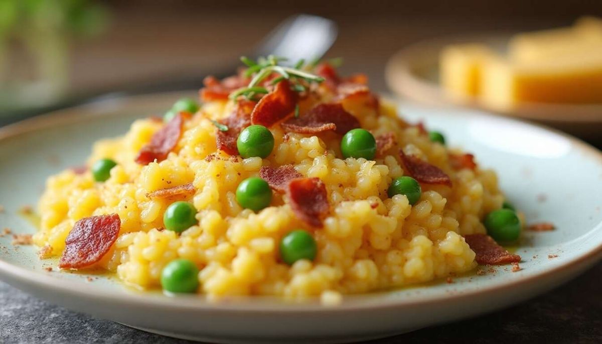 Le risotto au cheddar, bacon et petits pois est un plat savoureux et réconfortant, alliant l'onctuosité du fromage à la note fumée du bacon, le tout agrémenté de la fraîcheur des petits pois. Facile à préparer, il ne manquera pas d'éblouir vos invités.