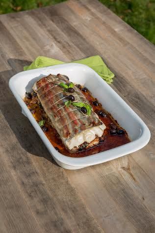 3. Étalez le mélange sur un filet de merlu, posez le second filet tête-bêche et poivrez. Disposez le bacon sur le dessus et ficelez le tout avec de la ficelle de cuisine pour le former en rôti.