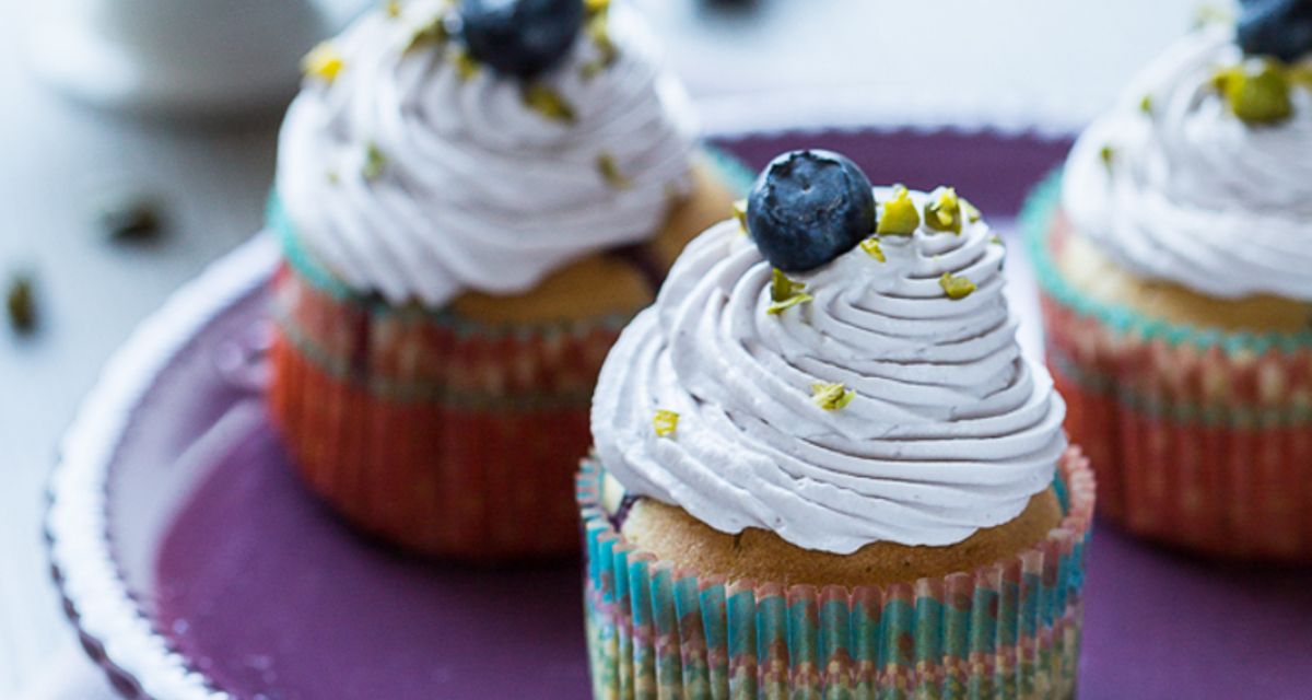 - À l'aide d'une poche à douille, décorez les cupcakes avec la crème et ajoutez quelques myrtilles et brisures de pistaches pour la touche finale.