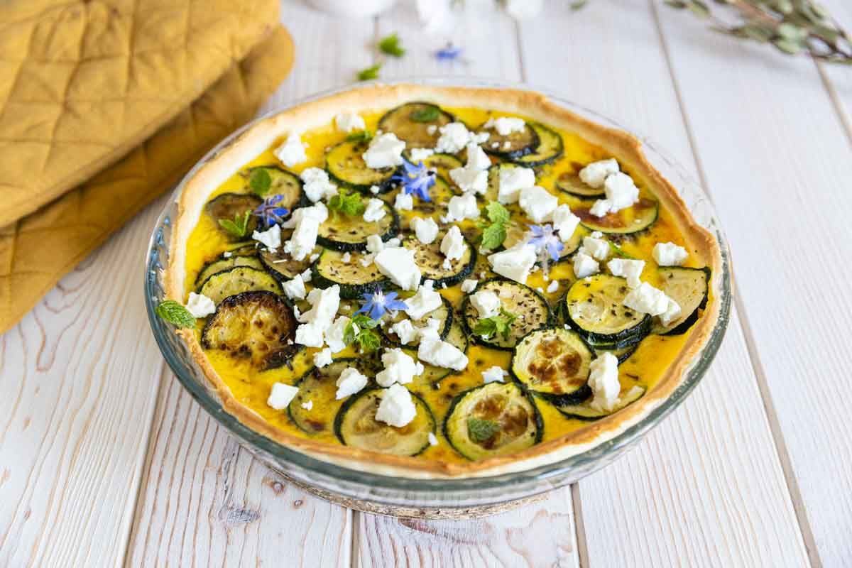 - Enfournez la quiche à 180°C pendant 25 minutes. À la sortie du four, émiettez la feta sur le dessus et ajoutez la menthe ciselée.