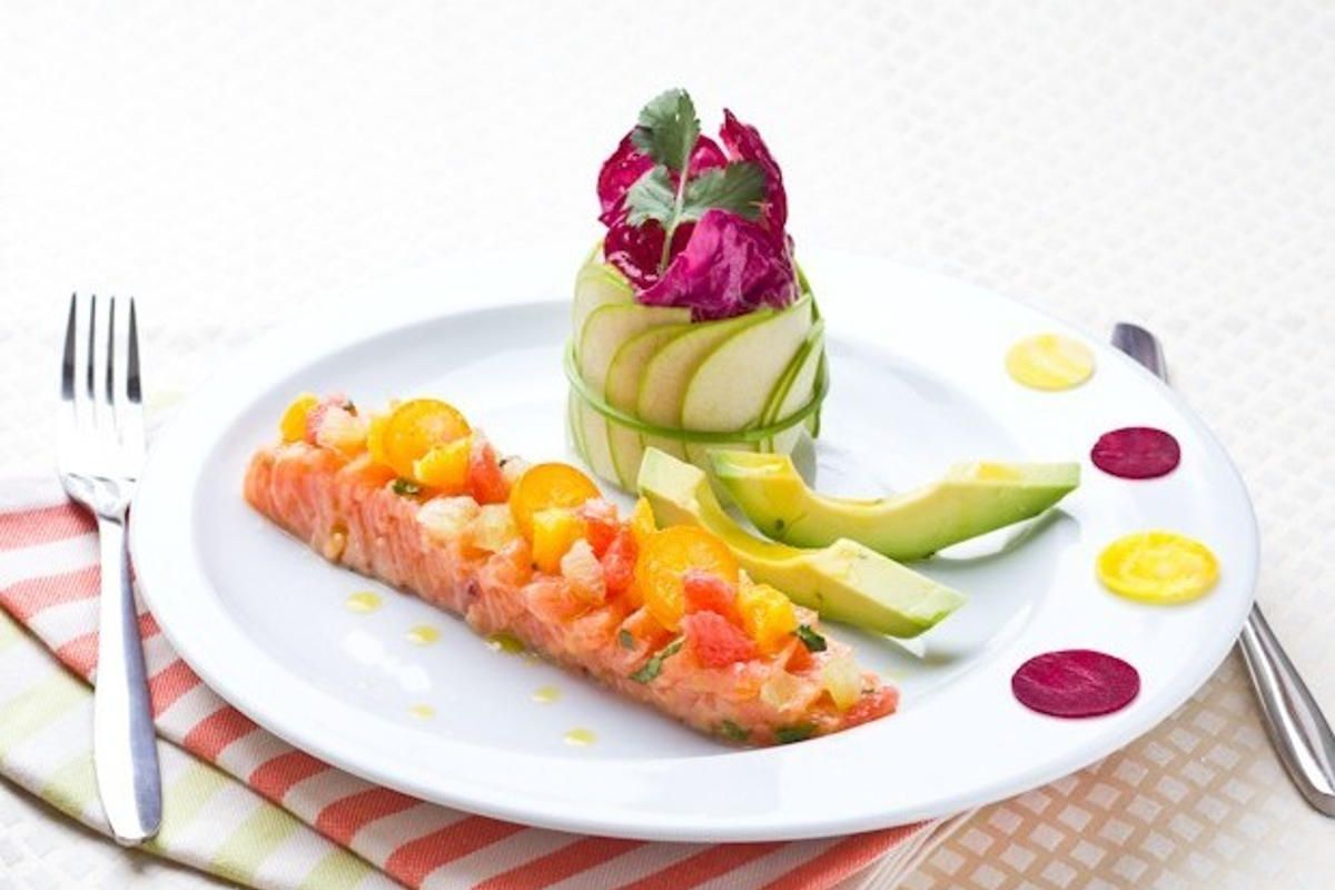 - Pour le dressage, tranchez les pavés de saumon et disposez-les dans les assiettes. Ajoutez les dés d’agrumes ainsi que le cercle de pomme et deux tranches d’avocat. Arrosez avec la marinade réservée et parsemez d'une pincée de fleur de sel.