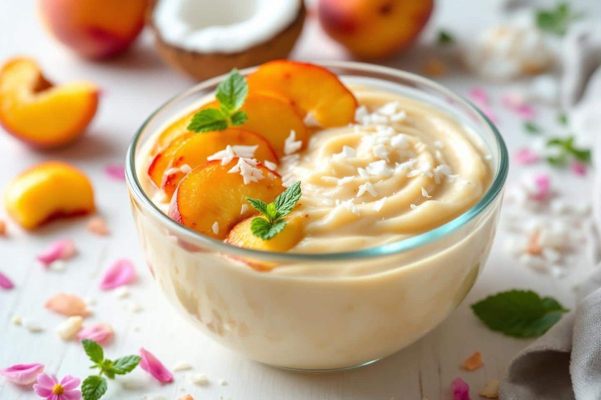 Avec l'arrivée de l'été et les marchés débordants de fruits juteux, l'envie de douceurs fraîches se fait sentir. Ce riz au lait, réinventé avec du lait de coco et sublimé par des pêches rôties, est une célébration gourmande des saveurs estivales. Les notes vanillées et la texture crémeuse viennent se marier à la douceur fondante des pêches pour un dessert à savourer seul ou à partager.