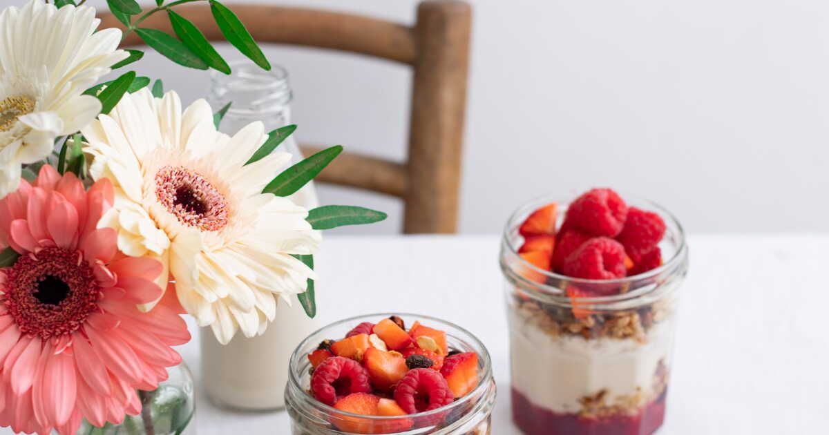 - Dressez les verrines : coulis au fond, granola, yaourt, et garniture de fruits frais.