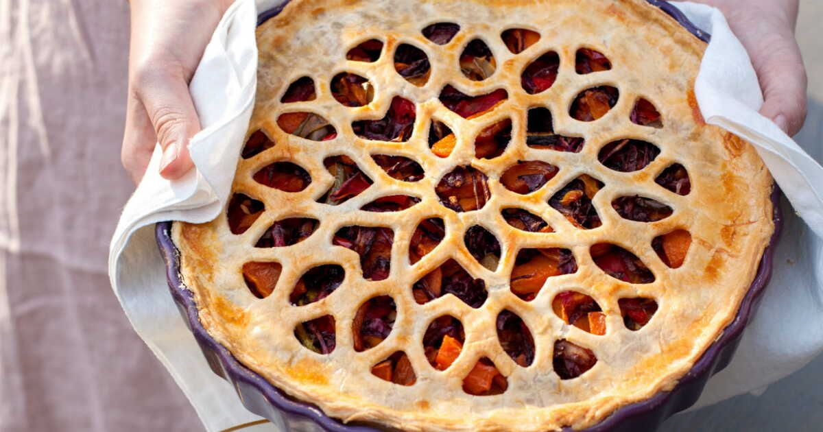 Étalez la pâte brisée dans un moule à tarte et piquez-la avec une fourchette. Répartissez le mélange de légumes grillés sur la pâte. Si vous le souhaitez, émiettez le fromage de chèvre par-dessus pour une touche crémeuse. Recouvrez avec un second disque de pâte, scellez les bords et faites quelques incisions sur le dessus pour laisser la vapeur s'échapper. Enfournez pendant 30 minutes ou jusqu'à ce que la croûte soit bien dorée.