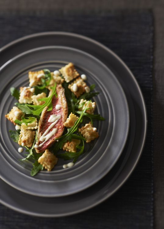 Pour le dressage, disposez une poignée de roquette sur chaque assiette, ajoutez un filet de rouget barbet accompagné de ravioles croustillantes, puis nappez le tout d'une onctueuse crème d'ail.